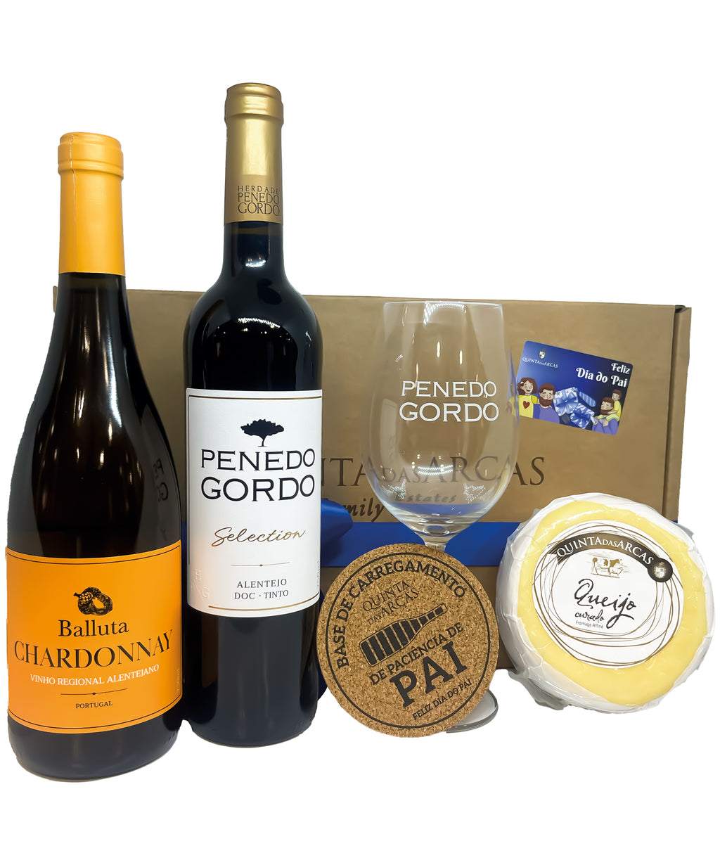 Comprend 1 bouteille de vin rouge Alentejo Penedo Gordo (750 ml), 1 boîte de 3 snacks Quinta das Arcas (salaison, ail et persil, mélange de piments), 1 sachet de biscuits Quinta das Arcas Cacos.