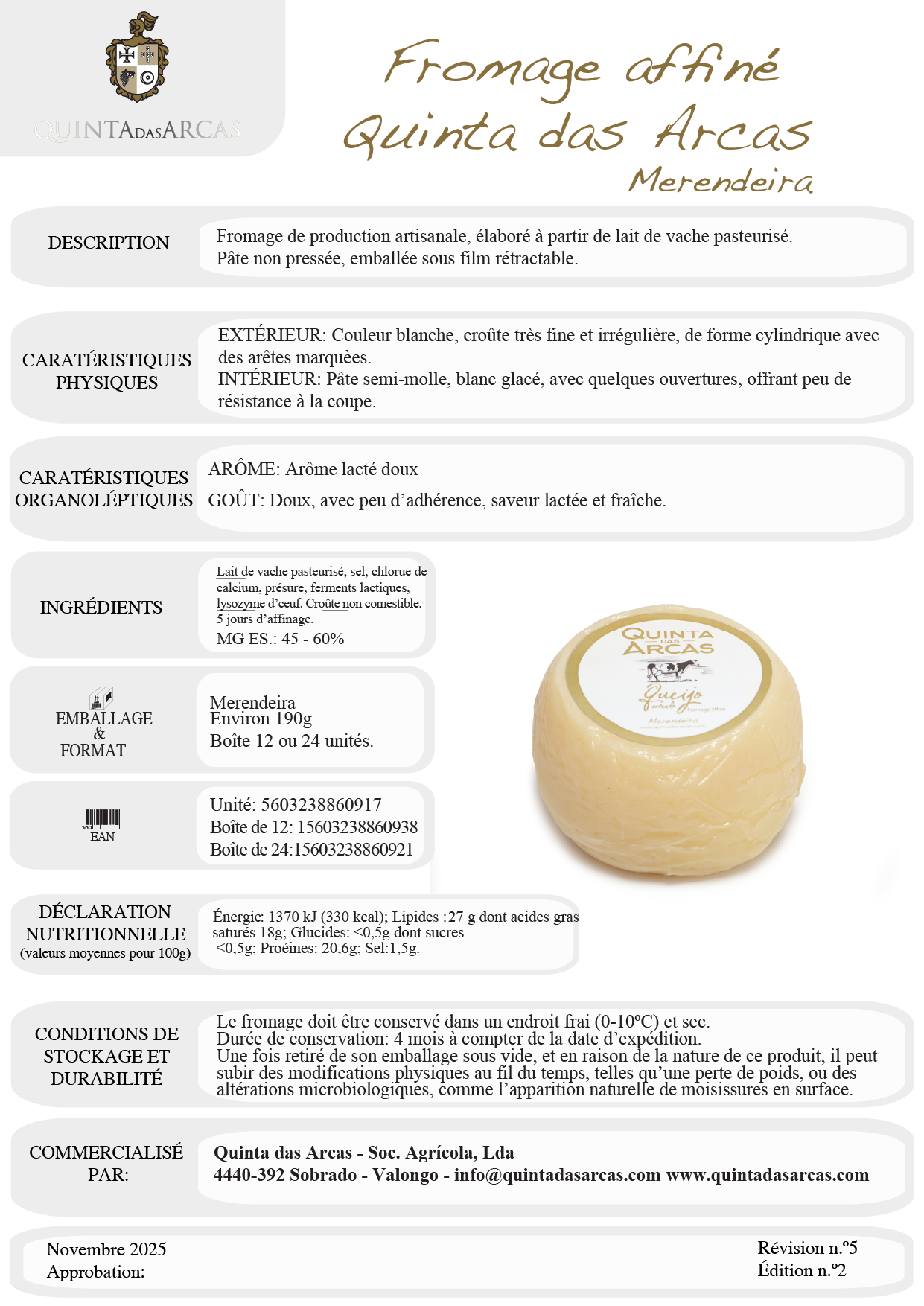 Fromage légèrement affiné Quinta Das Arcas
