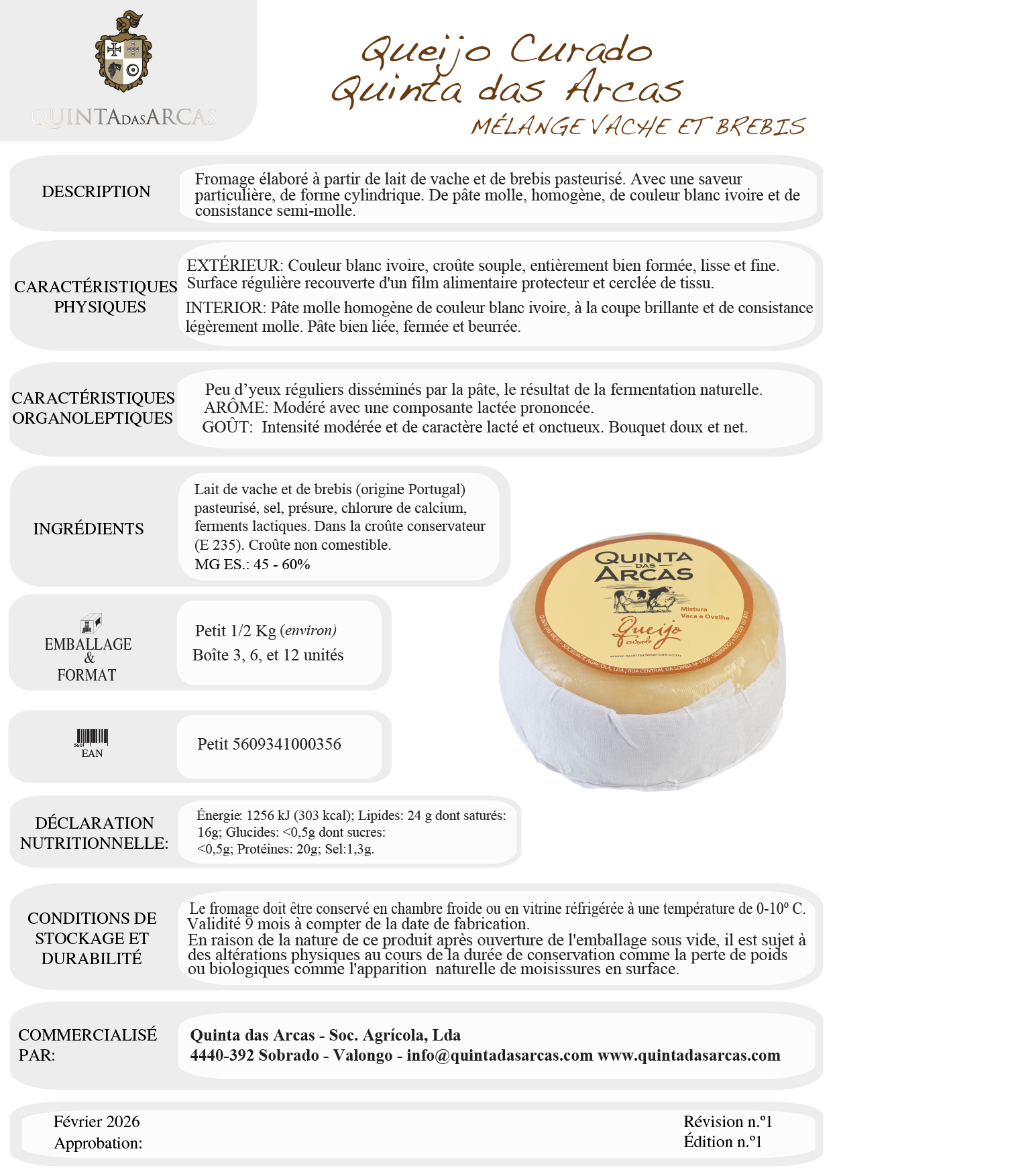 Fromage légèrement affiné Quinta Das Arcas